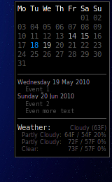 I recently switched to Arch Linux and decided to ditch evolution (a good but bloated program). Claws Mail works perfectly as an email manager but I couldn't get its calendar plugin to work properly. I have been using Zim for a while and noticed that it had a very basic calendar plugin; this was exactly what I needed. The plugin allows users to create pages in their wikis for individual days: no complex forms to fill out, just a simple page to keep track of what you are doing on a given day.