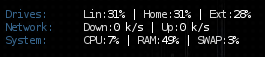 ${color1}Drives: ${color lightgrey}Lin:${color}${fs_used_perc /}% | ${color lightgrey}Home:${color}${fs_used_perc /home}% | ${color lightgrey}Ext:${color}${fs_used_perc /media/ext}%